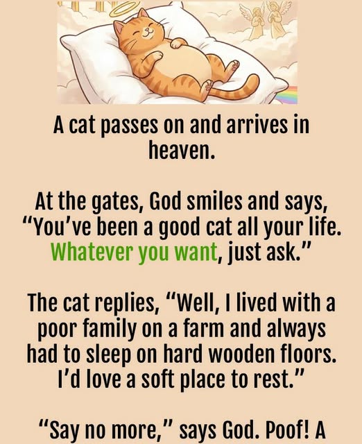 In the ethereal quiet of the afterlife, where the golden gates shimmer with an everlasting light, a humble farm cat finally reached the end of