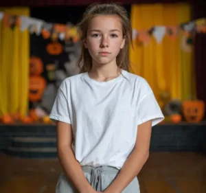 We’d turned the stage into a haunted art gallery — neon jack-o’-lanterns, glitter-glued haunted houses, and skeletons with googly eyes. I was standing on a ladder adjusting a crooked paper bat when I saw her — Ellie. She didn’t walk into the room so much as fade into it, like a shadow slipping under a door. Her shoulders were hunched, her eyes fixed on the floor. She wore gray pants and a plain white T-shirt. Her ponytail was pulled too tight, like it had been done in a rush.
