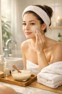 “Rice water sediment works as a gentle, nutrient-rich face mask that brightens and softens the skin.”