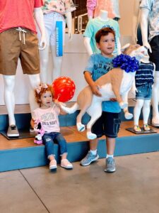 Little boy with autism holds his new Magic dog mannequin from Old Navy while his sister sits in the background holding a red balloon